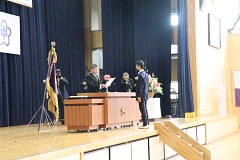| 10月15日(水)と16日(木)の昼休みに、後期生徒会および代議員の認証式が行われました。生徒会、1年生、2年生、3年生の代議員ごとに武道場にて実施しました。これから、皆を引っ張っていこうとする責任感と決意が感じられる認証式でした。 | |