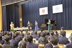 | 10月8日(水)、15日(水)、29日(水)の6限目に、「令和7年度 学校における文化芸術鑑賞・体験推進事業(芸術家の派遣)」による音楽鑑賞会が行われました。5人のプロフェッショナルの生演奏に触れた生徒たちは、熱心に耳を傾けていました。 | |