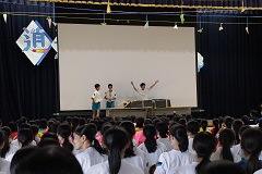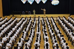 | 8月28日(木)に、40日間の夏季休業が終わり、2学期が始まりました。始業式では、校長先生から、夏休み中での生徒たちの活躍についての話や2学期も「未来に向けて やりたいことに とことん全力」のスローガンのもと、いろいろなことにチャレンジして、それぞれの目標に向けてしっかり取り組んでいくようにとの話がありました、 また、始業式後、2学期より赴任されたALTのエミリー先生の新任式を行いました。 |