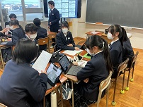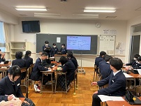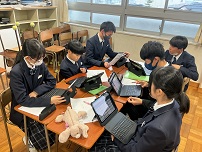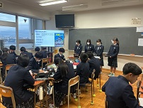 | 11月20日(木) に2年生、12月17日(水)に1年生が、総合的な学習の時間に進めている「探究学習」の発表会を実施しました。 2年生は、「春江町の魅力向上」を目指し、個人で「交通」「人口」「観光」などの8つのテーマを決めて探究学習を進めていました。1年生は3~4人のグループになり、「坂井市の課題」をみつけ、大野市と比較しながら、探究学習を進めていました。探究学習は、①地域の現状②課題を見つける②解決策を考える (調査)の手順で進めました。 発表会は、最初に坂井市の探究学習コーディネーターの方のお話を聞き、その後、体育祭の色ごとに分かれ、タブレットを使い、他学年に説明する形を取りました。発表者は少し緊張感を持ちつつ、いろいろな意見交換を行っていました。 |