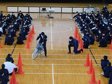 | 3限目に、坂井警察署交通課の方々による交通安全教室を開催しました。6名の職員の方から、危険な自転車走行の実演や来年の4月から施行される自転車運転の違反と罰則について、詳しく説明していただきました。生徒たちは真剣なまなざしで、今一度交通ルールを守り、安全な自転車運転をする決意をしました | |