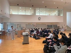 | 2限目に授業参観を実施し、3・4限にPTA教養委員会主催で、講演会を開催しました。福井ブローウィンズの満田丈太郎選手と湯本代表取締役をお招きし、「ともに巻き起こそう とてつもない旋風を」を演題として、これまでの歩みの中で挑戦を続けてきた経験を話していただきました。生徒たちが自分の未来に希望をもち、一歩を踏み出す勇気を育むきっかけとなりました。 | |